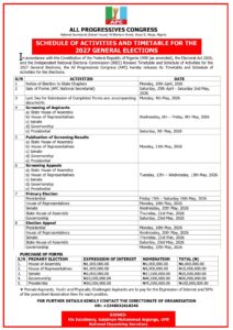 The All Progressives Congress (APC) has released its Timetable and Schedule of Activities for the 2027 General Elections.