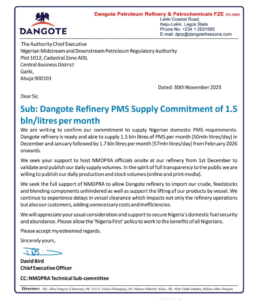 The Dangote Petroleum Refinery has formally informed the Nigerian Midstream and Downstream Petroleum Regulatory Authority (NMDPRA) that it is prepared to begin supplying large volumes of Premium Motor Spirit (PMS) to the Nigerian market starting December 2025.