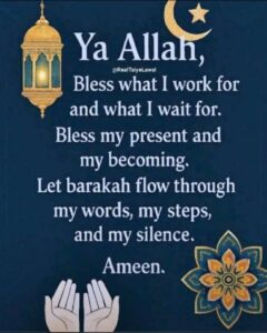 O Lord of the Throne, bless our families, our homes, and our sustenance. Accept our salah, our dua, and our remembrance of You. Grant us barakah in our time, rizq, and health.