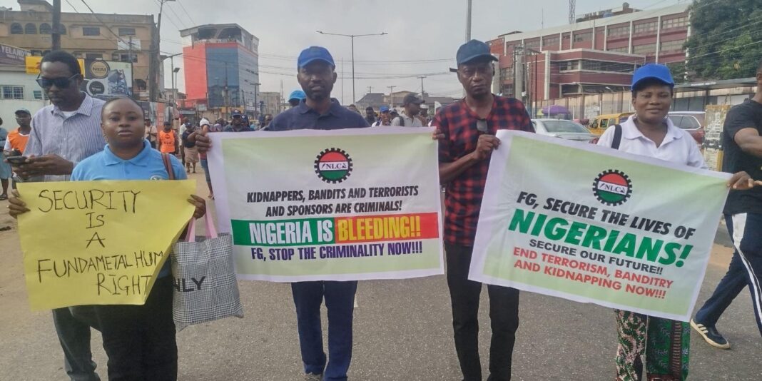 The Nigeria Labour Congress (NLC), in partnership with several civil society organisations, staged a protest in Lagos State on Wednesday, highlighting the deteriorating security situation across the country.