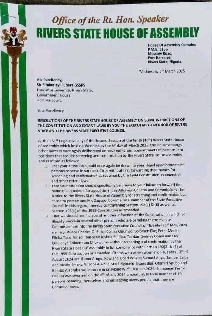 The House also ordered Governor Fubara to submit a new list of nominees for appointments as commissioners within 48 hours.