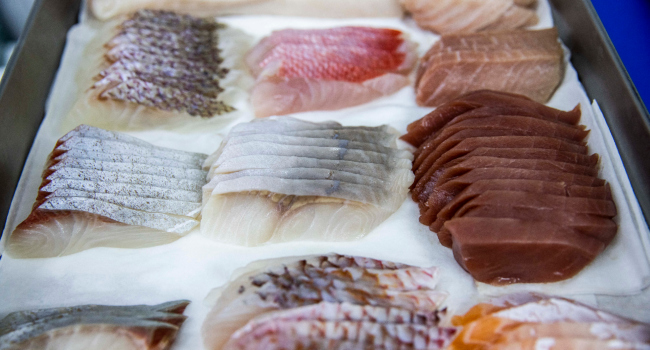 A tray of seafood is pictured in a kitchen for takeaway Japanese food in Hong Kong on August 24, 2023. China will suspend imports of Japanese seafood, media reports in Tokyo said on November 19, 2025, as a diplomatic spat between the countries deepens. China had only recently resumed purchasing marine products from Japan following an earlier ban imposed after the stricken Fukushima nuclear plant began releasing wastewater in 2023.
