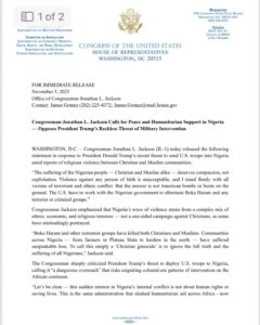 Congressman Jonathan L. Jackson’s stand is both principled and pragmatic. He refuses to let Nigeria’s crisis become a pretext for another foreign adventure. His appeal — to replace missiles with mentorship, and coercion with compassion — is a reminder that peace is built, not imposed.