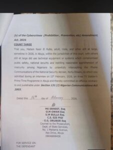 The first count alleges that his comments violate Section 12(1) of the Cybercrime Act Amendment, 2024. The second count states that maintaining contact with an individual who unlawfully accessed the NSA’s phone calls, without reporting it to security agencies, constitutes an offense under Section 27 of the Cybercrime Prevention and Prohibition Act, 2024 (as amended).
