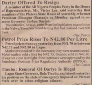 During a nationwide radio broadcast on May 18, 2004, Obasanjo described Dariye as an indecisive governor, and said his failure to intervene firmly to stamp out sectarian violence had led to the Yelwa massacre.