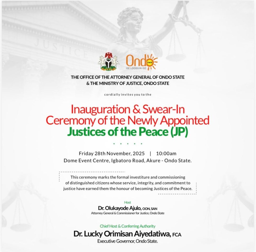 A formal swearing ceremony will take place on Friday, 28th November, 2025 at The Dome, Akure, Ondo State by 10.00am.
