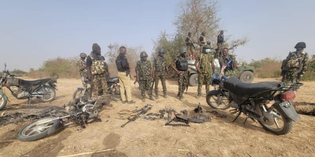 Following the encounter, troops conducted a thorough sweep of the surrounding area to prevent further threats and gather intelligence. A significant cache of weapons and other materials was recovered, including one OJC Gun, one PKT Gun, two AK-47 Rifles, four AK-47 Magazines, a bandolier of PKT ammunition, several rounds of 12.7mm ammunition, a camel bag containing ₦840,000, two mobile phones, and five motorcycles.