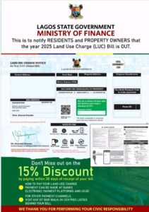 The commissioner therefore, called on property owners in Lagos to seize the opportunity to enjoy a 15% discount on their Land Use Charge payments.
