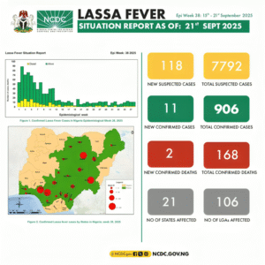 The Nigeria Centre for Disease Control and Prevention (NCDC) has confirmed that Lassa fever has claimed 168 lives across 21 states in 2025, with 906 cases recorded so far.