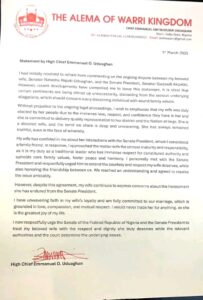 “My wife has confided in me about her interactions with the Senate President, whom I considered a family friend. In response, I approached the matter with the utmost maturity and responsibility, as it is my duty as a traditional leader who has immense respect for constituted authority and upholds core family values, foster peace and harmony.