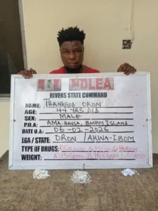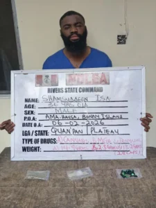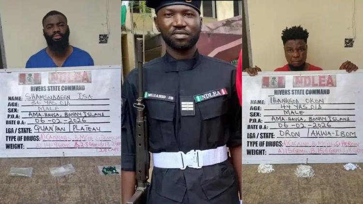 Operatives of the National Drug Law Enforcement Agency (NDLEA) have arrested six suspects during a raid on a notorious drug hideout known as Ama Hausa in Bonny Island, Rivers State, recovering a large cache of illicit substances including cocaine, heroin, methamphetamine, skunk, and tramadol.