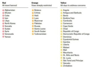 The red group consists of 11 countries- Afghanistan, Iran, Sudan, Syria, Libya, Cuba, Bhutan, Venezuela, North Korea, Yemen, and Somalia- whose nationals would be barred from entering the US.