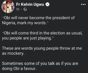 In a recent post shared on his official Facebook page, Fr. Ugwu expressed frustration at how young Nigerians frequently use Obi’s political chances as a tool for ridicule directed at him.