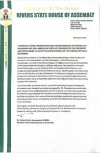 Sign in Welcome! Log into your account your username your password Forgot your password? Get help Password recovery Recover your password your email A password will be e-mailed to you. HomeNews#RIVERS STATE HOUSE OF ASSEMBLY ISSUES STATEMENT FOLLOWING EMERGENCY RULE DECLARATION. . News March 19, 2025 Updated: March 19, 2025 #RIVERS STATE HOUSE OF ASSEMBLY ISSUES STATEMENT FOLLOWING EMERGENCY RULE DECLARATION. [ ORIGINAL COPY]. By Arems Aduragbemi Share FacebookTwitterPinterestWhatsApp - Advertisement - Share FacebookTwitterPinterestWhatsApp Arems Aduragbemi Must Read News Southwest Monarch Holds Private Meeting with Yoruba Activist Igboho October 6, 2025 Celebrity Shalamar Lights Up Abuja: A Night of Nostalgia and Electrifying Energy October 5, 2025 News Nigerian Businesswoman Returns N1.9m Mistakenly Sent to Her Account, Declines Reward October 5, 2025 Documentaries Okonjo-Iweala’s Bold Defence of Reform: Why Nigeria Must Heed the WTO Chief’s Warning October 5, 2025 News Dangote to Redeploy Sacked Refinery Engineers to Sugar, Cement Plants October 5, 2025 News Adelabu Declares ‘It’s My Turn’ for Oyo Governorship in 2027 October 5, 2025 Related News Entertainment Imisi Crowned BBNaija Season 10 Winner, Secures N150m Grand Prize October 6, 2025 News Southwest Monarch Holds Private Meeting with Yoruba Activist Igboho October 6, 2025 Celebrity Shalamar Lights Up Abuja: A Night of Nostalgia and Electrifying Energy October 5, 2025 News Nigerian Businesswoman Returns N1.9m Mistakenly Sent to Her Account, Declines Reward October 5, 2025 Documentaries Okonjo-Iweala’s Bold Defence of Reform: Why Nigeria Must Heed the WTO Chief’s Warning October 5, 2025 - Advertisement -
