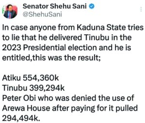 In case anyone from Kaduna state tries to lie that he delivered Tinubu in the 2023 Presidential election and he is entitled, this was the result;