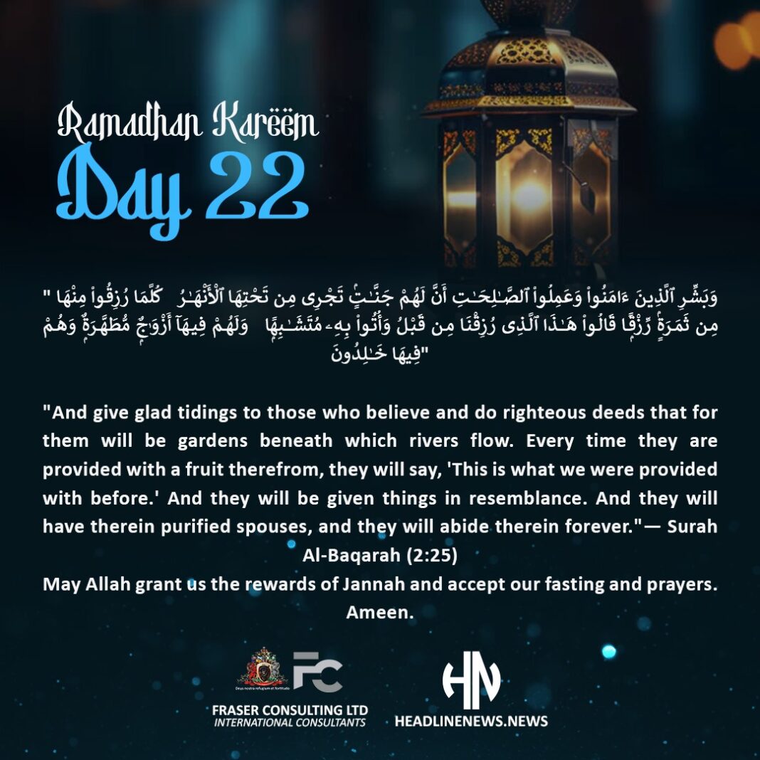 As we enter the 22nd day of Ramadan, we reflect on the immense blessings of this sacred month and seek guidance from the Qur’an. Here are some powerful verses that resonate with the themes of mercy, forgiveness, patience, and gratitude: