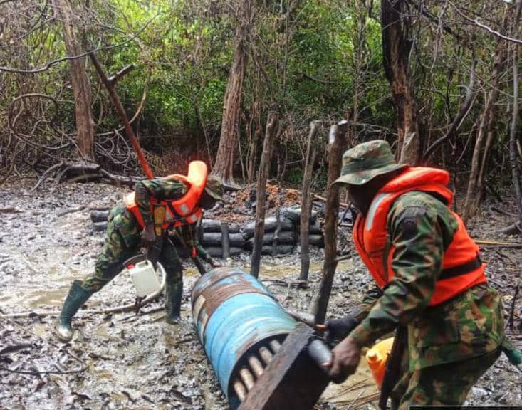 In Rivers State, troops intercepted two wooden boats loading Premium Motor Spirit at a jetty in Okrika Local Government Area (LGA). Another boat carrying over 33,000 litres of stolen products and a second with over 5,000 litres were also seized in Okrika. At Elele Alimini in Emohua LGA, a tanker (registration number Rivers JJN 287 ZU) suspected of carrying 90,000 litres of stolen products was impounded, and two suspects, the driver and his assistant, were arrested. In Abua/Odual LGA, troops recovered over 2,600 litres of illegally refined Automotive Gas Oil. Along the Imo River, two illegal refining sites were deactivated, with three drum pots, three receivers, and over 2,500 litres of stolen crude seized in Ukwa West LGA, Abia State. At Orashi River waterside, two boats with over 700 litres of Dual Purpose Kerosene were intercepted, and six suspects were arrested.