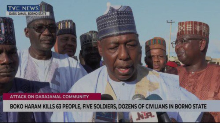 Borno State Governor Babagana Zulum expressed deep sorrow and frustration after Boko Haram killed 63 people, including five soldiers, in a brutal attack on Daraj Jamal, Bama LGA. Visiting the affected community, Zulum disclosed that he had previously warned National Security Adviser Nuhu Ribadu about the military’s inability to tackle the insurgents alone, stating the massacre could have been averted if his advice was followed.